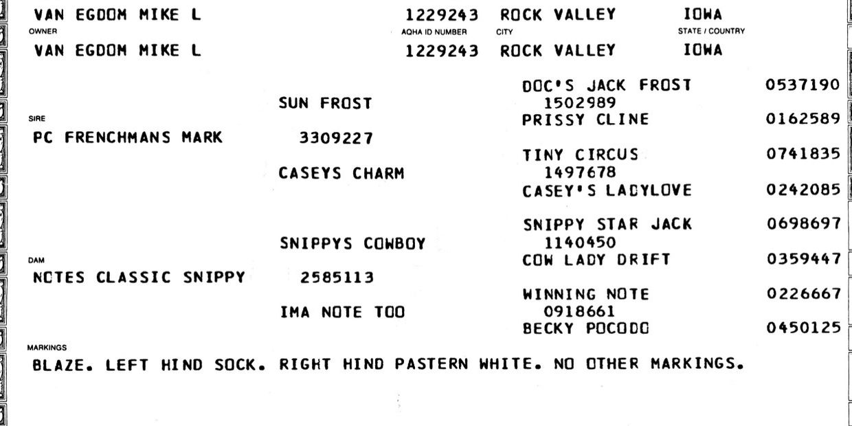 Marks Classic Note has been Jason's main head horse and a back up heel horse for Bammer. We are excited for this mare to be a cornerstone of our breeding program for years to come. Check out the Frenchmans Quarter Horses website link below for more information on the strong mare line in her pedigree!